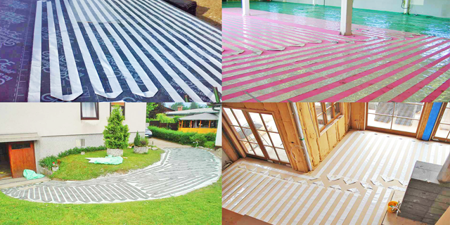The heating elements of this system are insulated aluminum strips 6, 8, 12 and 17 cm wide, 0.2 mm thick. They are laid below or on the screed in the floor, or below the plasterboard or mortar for wall mounting and are fed by transformed low-voltage electricity (from 3 V to 48 V). We can also put heating strips on existing floor coverings.